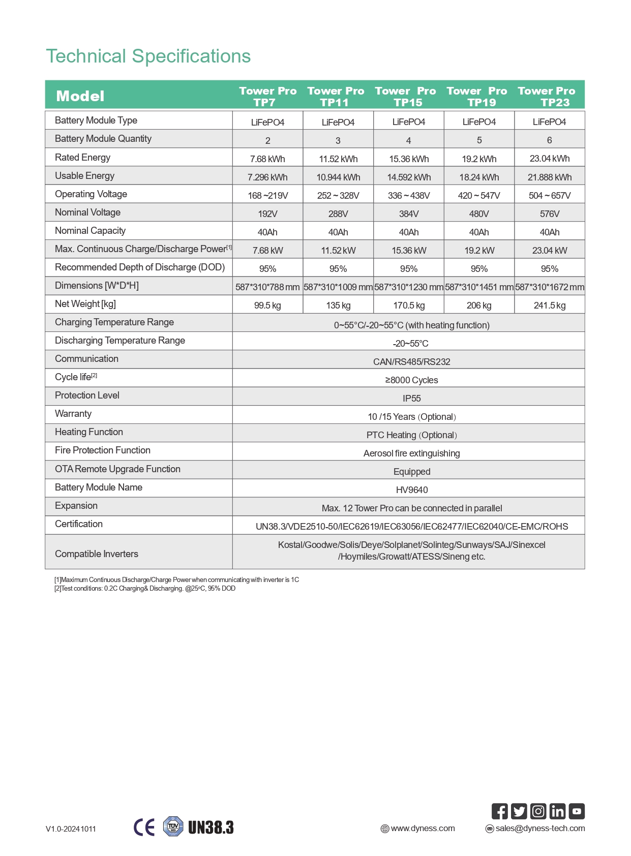 System Dyness HV9640 oferuje opcję rozbudowy pojemności do 23,04 kWh. Dzięki modułowej konstrukcji użytkownicy mogą łączyć do sześciu modułów o pojemności 3,84 kWh każdy. Dlatego system można elastycznie dopasować do rosnących potrzeb energetycznych.
